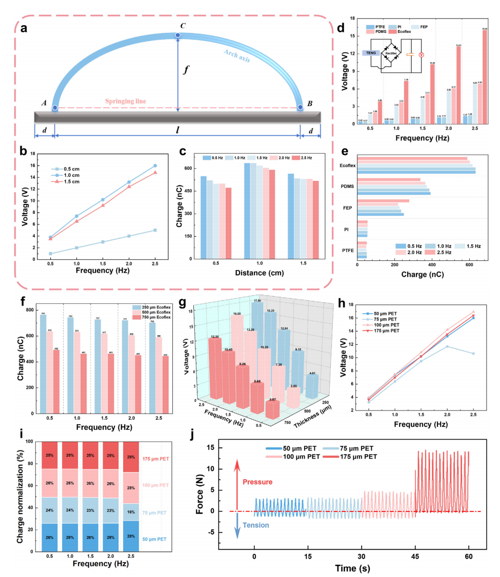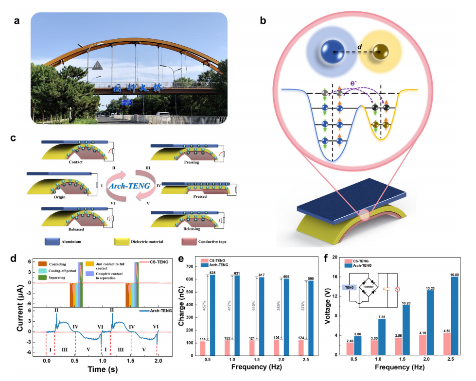 研究概述 Advanced Materials 波浪能作为一种可再生能源,其开发利用可降低化石能源污染,助力碳中和目标实现。传统电磁发电机(EMGs)在低频条件下转换效率较低,限制了其大规模应用。2012 年问世的摩擦纳米发电机(TENGs)为波浪能收集提供了新途径,它具有材料选择范围广、低频适应性强、质量轻、成本低等优势,但仍受海洋腐蚀与低频捕获效率不足等问题制约。中国科学院海洋研究所王秀通研究员团队设计了一种拱形结构摩擦纳米发电机(Arch-TENG),通过形变弯曲实现波浪能捕获。与传统接触分离式摩擦纳米发电机(CS-TENG)相比,其电荷转移量提升 450% 以上;在 0.5 Hz 频率下,电荷输出密度可达 12.7 nC/cm²,且经 26 小时测试后性能保持稳定。基于该拱形结构,研究进一步设计了可用于大规模波浪能收集的阵列集成器件。实验验证表明,该器件不仅能稳定为低功耗电子设备供电,还可应用于 Q235 碳钢在海水中的阴极保护测试,为摩擦纳米发电机在海洋环境中的实际应用提供了更广阔的前景。 该文章以“Arch Shaped Triboelectric Nanogenerator for Wave Energy Harvesting and Corrosion Protection”为题,发表在《Advanced Materials》上。