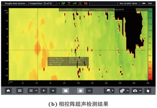 检测对象为某核电厂SEK系统衬塑管道。检测设备包括压电陶瓷低频超声导波检测系统和超声相控阵检测系统两套设备。 压电陶瓷低频超声导波检测系统包括低频导波探伤仪主机、压电陶瓷探头、电缆连接线,打气筒以及电脑。相控阵超声检测系统包括相控阵超声探伤仪主机、编码器,连接线以及探头。 压电陶瓷低频超声导波检测系统作为大面积检测手段,发现缺陷信号后,对缺陷信号进行定位,然后使用相控阵超声检测进行验证,判断实际壁厚,分析减薄趋势,通过验证结果判断管道基体的腐蚀状态,从而间接判断衬塑的基本状态。 衬塑管道基本情况 核电厂SEK系统衬塑管道,设计寿命为60年,工作介质为放射性废水(低放射性),最高工作压力为0.4 MPa,最高工作温度为60 ℃。管道公称直径为250 mm,壁厚为7 mm,每根管长约8 m,管道之间用法兰进行连接,共计长度约1200 m,管道材料为碳钢,管道要求最小允许壁厚为5 mm。 检测结果及分析 对整个SEK系统衬塑管道进行检测,发现11处异常位置,检测结果如图2所示,信息汇总如表1所示。 图2 现场管道1SEK-15位置处检测结果 表1 某SEK衬塑管道检测结果汇总(mm) 由超声导波检测结果可知,检测结果中需关注的特征信号共4个,即特征信号−F2、−F1、+F1及+F2(正负表示方向),−F2、−F1和+F1与管道结构特征(法兰、支撑及焊缝)相吻合,但+F2法兰信号幅值过低,探头与法兰间无明显使导波信号衰减的管道特征,判断探头至法兰间可能发生大面积腐蚀。 由相控阵超声检测结果可知,管道腐蚀为局部腐蚀,腐蚀形貌呈坑状,剩余壁厚最小值为4.96 mm,腐蚀减薄29.1%,腐蚀区域尺寸约为70 mm×45 mm,黑色区域是因管道表面凹凸不平,相控阵超声探头未与管道完全耦合的结果。 根据核电厂要求,管道的最小允许壁厚为5 mm,缺陷壁厚最小值小于最小允许壁厚,故需要对该管道进行评估或维修更换。