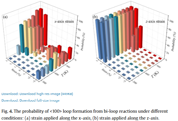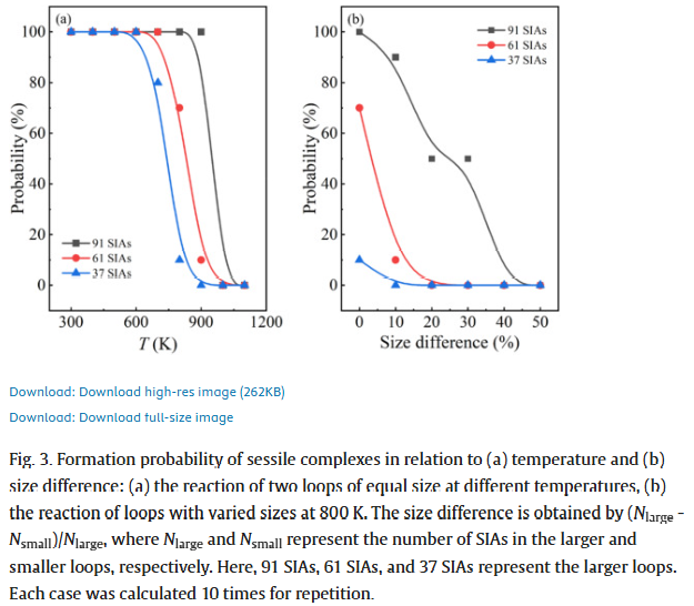 在高能粒子辐照环境下,材料内部会不断产生和演化位错环等缺陷结构,深刻影响材料的微观组织稳定性及服役性能。尤其是在体心立方(bcc)金属中,实验中频繁观测到的 <100> 位错环,因其理论稳定性低、迁移能力弱,其真实形成机制长期以来备受争议,成为辐照损伤物理中的关键科学问题之一。 围绕这一难题,北京航空航天大学吕广宏教授团队以 bcc 铁为模型体系,基于大规模分子动力学模拟,系统研究了外加各向异性应变条件下,1/2<111> 位错环相互作用与 <100> 位错环形成的原子机制。研究发现,应变不仅显著改变位错环反应路径,更可大幅降低反应能垒,从而为 <100> 位错环的“高频出现”提供了全新的物理解释。 该工作在机制层面打通了模拟—实验—预测模型之间的关键链条,为辐照损伤演化评估及抗辐照材料设计提供了重要理论支撑。 文章信息 https://doi.org/10.1016/j.tramat.2025.100008 文章亮点速览 亮点一|应变驱动 <100> 位错环形成 工作内容:通过分子动力学模拟,系统比较了无应变与单轴拉/压应变条件下,两条滑移的 1/2<111> 位错环相互作用行为,首次明确指出:在无应变条件下几乎不可能形成<100> 位错环,而外加各向异性应变可显著促进其生成。 研究价值:突破传统“位错反应需苛刻几何条件”的认知,为实验中<100> 位错环的普遍存在提供合理物理解释。 亮点二|两类原子尺度反应路径 工作内容:研究发现,在不同应变方向下,位错环反应可分别经历共面模式与非共面模式两类演化路径,涉及多中间态、多间隙原子的协同重排过程。 研究价值:系统构建 <100> 位错环形成的完整原子图景,丰富了辐照缺陷动力学的微观认知。 亮点三|应变降低反应能垒 工作内容:结合 NEB 方法与 Arrhenius 分析,定量给出了各关键反应步骤的激活能垒,并揭示其随单轴应变增加而显著降低,部分路径甚至转变为“近乎无能垒”过程。 研究价值:从动力学角度解释了应力/应变环境对辐照缺陷演化的放大效应。 亮点四|形成概率预测模型 工作内容:综合应变幅值与位错环尺寸差异,构建形成概率预测模型,并与分子动力学结果高度一致。 研究价值:为团簇动力学、动力学 Monte Carlo 等多尺度模拟提供可直接嵌入的物理模型。 文章核心图表 结语 总体而言,吕广宏教授团队围绕辐照损伤领域中极具争议的 <100> 位错环问题,从原子尺度出发,系统揭示了外加载应变在调控位错环反应路径与动力学行为中的关键作用。研究不仅澄清了 <100> 位错环“低稳定性却高出现频率”的长期矛盾,也为理解辐照条件下复杂缺陷结构的演化机制提供了坚实的理论依据。 更重要的是,该工作突破了传统位错反应模型对几何条件和尺寸匹配的严格限制,提出了一种更具普适性的形成机制,并通过定量预测模型实现了从微观机制到工程评估的跨越。 该成果对核结构材料、航天服役材料及其他极端环境用材料的辐照损伤评估具有重要指导意义,也为未来应力/应变调控缺陷演化、设计高抗辐照性能材料提供了新的研究思路与方法框架。