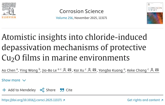 中科院宁波材料所《Corrosion Science》在原子尺度揭示海洋环境中氯离子诱发铜钝化膜破裂关键机制