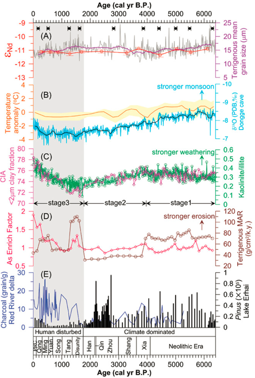 图:过去6400年以来红河流域风化侵蚀与陆地记录对比