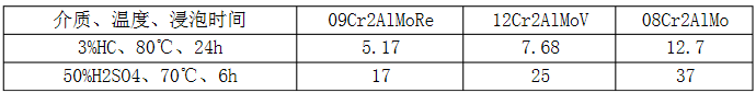 1、09Cr2AlMoRe与不含稀土的08Cr2AlMo相比,抗腐蚀性能更强从表1、表2可以看出,09Cr2AlMoRe与不含稀土的08Cr2AlMo相比,在80℃、3% HCl水溶液和70℃、50%H2SO4水溶液中的对比试验中,09Cr2AlMoRe的耐腐蚀能力是不含稀土的08Cr2AlMo钢的2.46倍和2.18倍;在100℃、980PPmH2S水溶液的对比试验中,09Cr2AlMoRe的耐腐蚀能力是不含稀土的08Cr2AlMo钢的1.53倍,是10#钢耐腐蚀能力的近6倍。