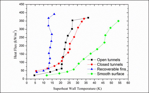 两所科研人员选取在高效换热器中广泛应用的多孔表面换热强化结构进行了原理验证,在TiNi记忆合金材料上加工了具有开放通道、封闭多孔通道、及可变形多孔通道的表面结构(图1),对沸腾换热进行了对比实验。对于具有微细多孔结构的换热表面,封闭通道有助于在较小过热度下实现沸腾起沸,而开放通道利于大热流密度下的汽液交换,从而具有较高的换热系数。实验结果表明,具有可变形微结构的表面,结合了封闭通道和开放通道两者的优点(图2),在提高换热系数和提高适应热负荷变动能力方面具有很大的优势(其机理见图3)。