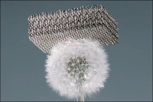 Microlattice外观看起来像是海绵或者说网状物体,柔韧度高,强度大。重量只有碳化纤维的十分之一,比空气还轻。据研究人员测评,它轻轻一吹就会飘起来,甚至可以乘在一朵蒲公英上。另外,如果利用Microlattice把鸡蛋包裹起来,即使从高楼上扔下去,鸡蛋也不会破。