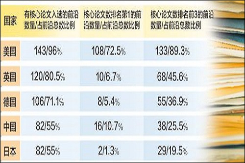 《2015研究前沿》通过同学科同年度中根据被引频次排在前1%的高被引论文(核心论文)来代表当前热点内容,根据各国作者入选热点前沿和新兴前沿中的核心论文来反映各国在各个领域的前沿贡献度。从数据看,美国在143个前沿(占149个前沿的96%,下同)都有核心论文入选,且在108个前沿的核心论文数都排名第1(72.5%);中国在82个前沿(55%)有核心论文入选,在16个前沿中核心论文数为第1名(10.7%),超过英国(10个)、德国(8个)和日本(2个前沿),显示中国具有较强的前沿贡献度,在某些重要前沿跻身世界先进行列。报告也注意到,中国有38个前沿进入核心论文数前3名(25.5%),英国和德国分别有68个(45.6%)和55个(36.9%)前沿进入前3名。由于美国核心论文数第1的前沿数占多数,各国在前3名的竞争更反映了各国在这些前沿中的竞争能力。