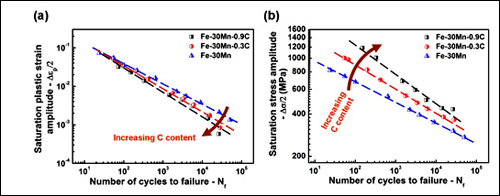 图1. Fe-Mn-C钢的疲劳寿命曲线:(a)塑性应变幅-寿命曲线(Coffin-Mansion公式);