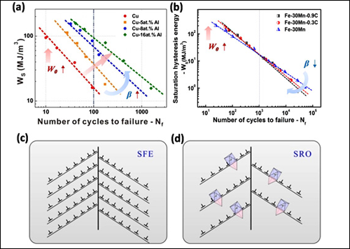 (b)Fe-Mn-C钢能量-寿命曲线;层错能(SFE)和短程有序(SRO)对