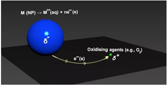 图1氧化还原导致的金属纳米颗粒的溶解反应机理。其中,电子通过宏观尺度的电极基底从金属颗粒转移到界面上任意位置上,很可能相隔很远(远远超过电子隧穿距离),的氧化剂(这里指溶解氧)分子中。