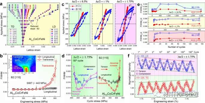 综上所述,研究者的工作为理解多组分B2析出强化HEA的循环变形机制提供了一个完整的思路,并通过引入可变形的多组分金属间析出相来指导抗疲劳合金的设计,这些析出相可以通过调整HEAs成分和热机械加工很容易实现。(文:水生)