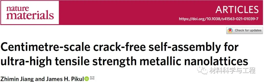 纳米点阵,具有迷人的力学、能量转换和光学等特性,但在制备大型纳米点阵的同时保持致密规则的纳米特性仍是一个挑战。在此,来自美国宾夕法尼亚大学的Zhimin Jiang & James H. Pikul报道了一种无裂纹自组装方法来制备厘米尺度级别的镍纳米点阵,其无裂纹面积比以前的自组装纳米点阵大得多,且比3D打印纳米点阵的单胞数量更多。相关论文以题为“Centimetre-scale crack-free self-assembly for ultra-high tensile strength metallic nanolattices”发表在Nature Materials上。