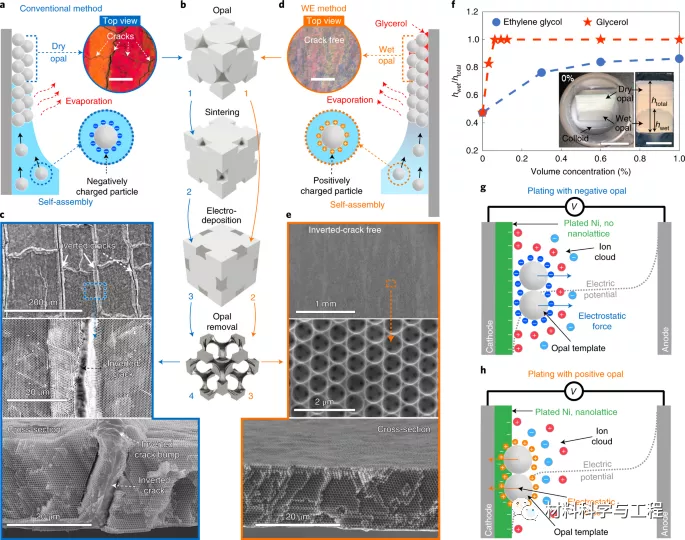 然而,自组装模板容易产生密集的裂纹。当填充材料时,这些裂纹会形成倒裂纹结构,将样品分成小的纳米点阵域,造成应力集中,阻碍流体/气体传输,并增加光学散射。虽然很多研究集中在制备自组装纳米晶,也有一些试图消除倒置裂缝,但目前尚没有一种自组装制备方法,能够产生没有倒置裂缝的大面积金属纳米晶。一种消除模板裂缝并精确控制数百万单元金属纳米结构的方法将实现具有前所未有的性能的纳米点阵,并使其在传感、能量转换和力学方面的应用成为可能。