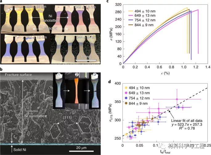 导读:本文报道一种无裂纹厘米尺度的多功能金属纳米晶格,可以进行宏观拉伸测试。在1.12%应变下抗拉强度为257 MPa,密度为2.67 g cm-3,是相同相对密度下最强多孔金属强度的2.6倍,体积比其他纳米点阵小10倍。