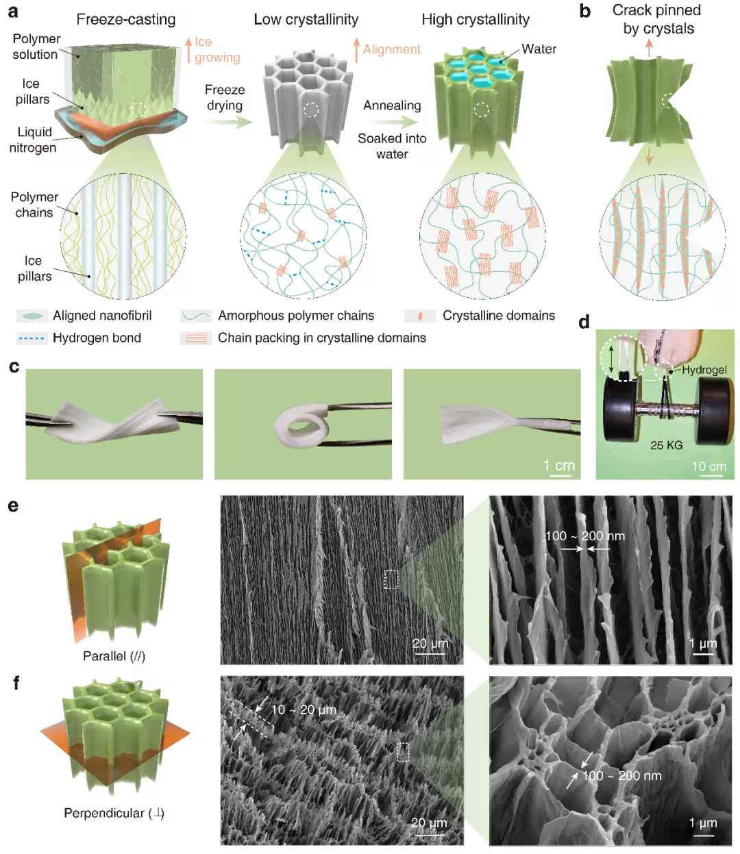 刘吉团队报道的方法只需要两步简单的工艺(图1):首先通过冷冻铸造实现水凝胶内部多尺度微/纳米结构的构建,随后通过热处理调控纳米晶域的可控分布,有效的抵抗裂纹拓展。为了验证抗疲劳水凝胶的设计原理,该团队选用医用聚合物聚乙烯醇(PVA),获得高含水量(~ 90%)的水凝胶材料。这类水凝胶沿着冷冻铸造方向展现出优异的力学性能,可以轻易地提起比自身重3万多倍的重物,断裂韧性高达116 kJ m-2。
