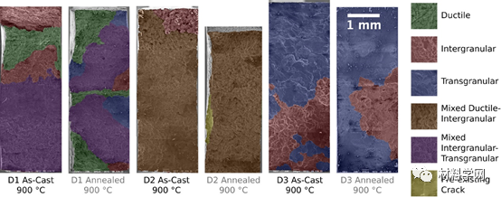 图7 在900℃下测试的拉伸试样的断裂表面。颜色表示断裂模式。