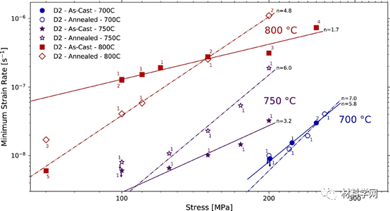 图8 在700、750和800℃下测试的合金D2的稳态蠕变速率图。显示了每个温度和条件下的幂律指数。