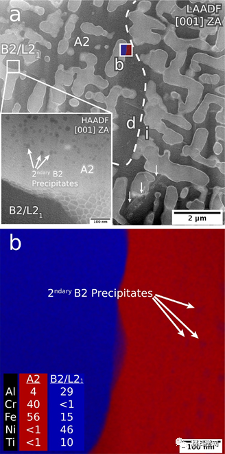 图4:第一行图像显示了铸态条件下D1-D3的STEM-EDS图的NMF-PCA分解载荷。量化的相组成(at.%)直接显示在有序(B2/L21)和无序(A2)相的图像中。三张图的比例一样。第二行图像显示相位结构和界面位错网络,使用低角度环形暗场(LAADF)探测器成像,该探测器显示原子序数和衍射对比度。所有三个图像的比例都是相同的。(d)中的插图暗场图像是用g1`11L21和g2`22L21扩散矢量从同一区域拍摄的。对于g1`11L21,超晶格APB的位置用白色箭头表示。(e)和(f)中的插图HAADF图像已经过傅里叶滤波以去除高频噪声,并且每个图像都显示了合金D2和D3中有序和无序相畴之间的单一界面……