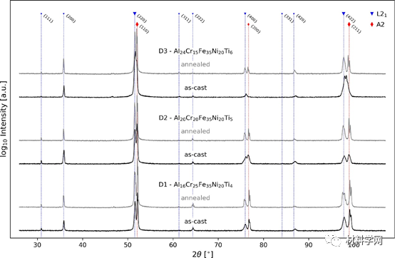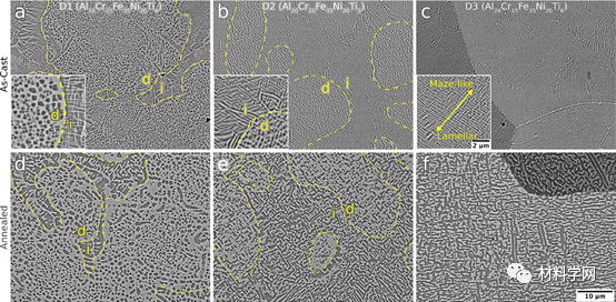 图3合金 D1-D3 在退火和铸态条件下的BSE SEM图像,所有图像的比例相同。铸态图像中的插图显示了代表性区域的更高放大倍数,所有插图的比例相同。在所有图像中,亮域被识别为 A2 相,暗域被识别为B2/L2。合金D1和D2已确定枝晶(d)和枝晶间(i)区域。铸态合金 D3 的插图中显示了一个具有更多迷宫状外观的区域和一个具有更多层状外观的区域。