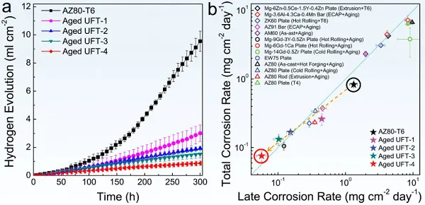 近日,金属所中科院核用材料与安全评价重点实验室许道奎研究员团队与南京工业大学信运昌教授课题组合作在制备高强高耐蚀镁合金材料方面取得重要进展。他们采用多道次三向压缩技术制备孪晶组织,通过对压缩路径及道次应变的独特设计,利用12道次低应变和高应变循环交替压缩,在AZ80镁合金中成功地制备出平均片层厚度约为200 nm的高密度孪晶组织,使平均晶粒尺寸从初始材料的33 mm左右细化至300 nm,其抗拉强度高达469 MPa,是已报道该系列镁合金中强度最高的。利用高密度超细孪晶组织细化晶粒,不仅避免了非平衡晶界对耐腐蚀性能的不利影响,而且改变了β-Mg17Al12相的形貌及分布。β-Mg17Al12析出相呈颗粒状,细小且均匀分布在镁基体中,显著抑制了局部腐蚀的发生,将腐蚀速率降低了一个数量级。该研究成果以“Evading strength-corrosion tradeoff in Mg alloys via dense ultrafine twins” 为题发表在《自然·通讯》(Nature Communications)上。