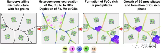 图七。纳米晶CoCuFeMnNi合金热处理后的微观组织演化示意图