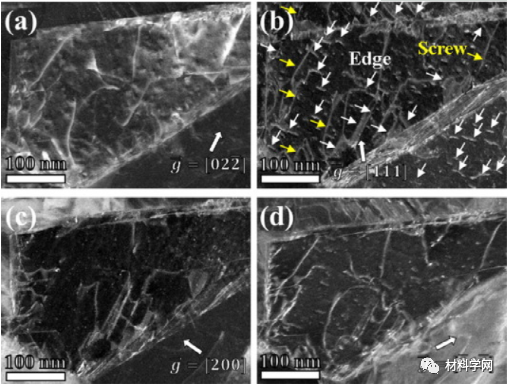 图5. TEM双束成像技术分析Mo5合金在4.2K变形后的位错特征