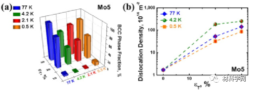 2)Mo5合金具有优异的低温力学性能,包括高屈服强度(1075MPa)和良好的应变硬化能力,在4.2K时,抗拉强度高达1651MPa,这主要是由于FCC向BCC和HCP相的转变(变形诱发马氏体)。