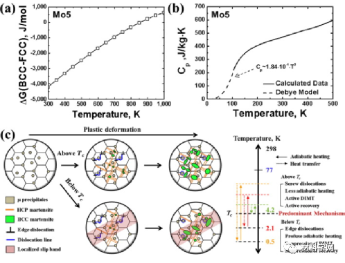 图6. Mo5合金的热力学计算结果和主要的温度依赖性机制示意图。