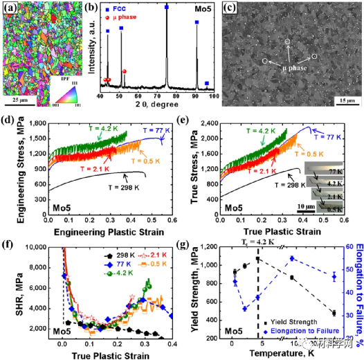 图1. (a-c)Mo5中熵合金初始组织;(d-g)Mo5合金在室温到0.5K低温下的力学性能
