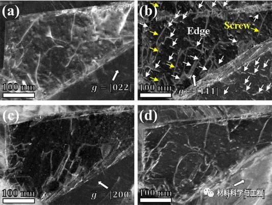 图6 采用TEM双束成像技术分析了4.2K变形Mo5合金的位错特征。