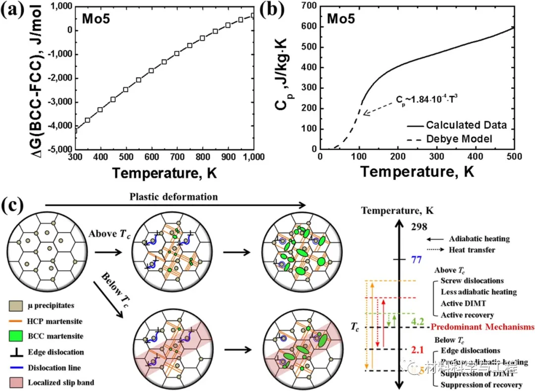 图7 Mo5合金的热力学计算结果和主要的温度依赖机制。