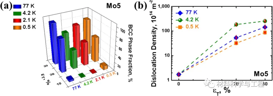 2. 由于由FCC向BCC的变形诱发马氏体转变,或者在较小程度上是HCP晶体结构,Mo5合金具有优异的低温力学性能,包括高屈服强度(1075 MPa)和良好的应变硬化能力,在4.2 K时,抗拉强度高达1651 MPa。