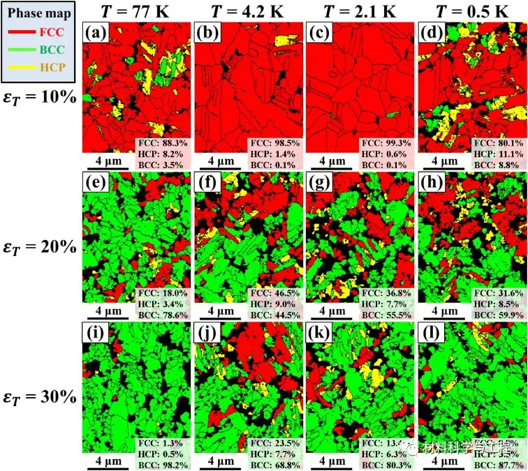 在过去的二十年中,人们开发出了新的高、中熵合金(HEAs和MEAs),这一领域的研究正在蓬勃发展。HEAs/MEAs的定义一般是根据合金的构型熵来定义的。在这些材料中,面心立方(FCC) HEAs/MEAs,在低温下表现出优异的力学性能,这是由于缺陷、变形诱发孪晶和/或变形诱发马氏体相变(DIMT)的强化作用。特别是,通过化学成分和变形温度控制相稳定性的DIMT的“亚稳态工程”方法已广泛应用于新型HEAs/MEAs的设计。近年来,人们研制出了在77 K下,具有良好应变硬化和抗拉强度特性的亚稳态亚铁MEAs。这些性质,被认为是FCC到体心立方(BCC)晶体结构的DIMT的结果。