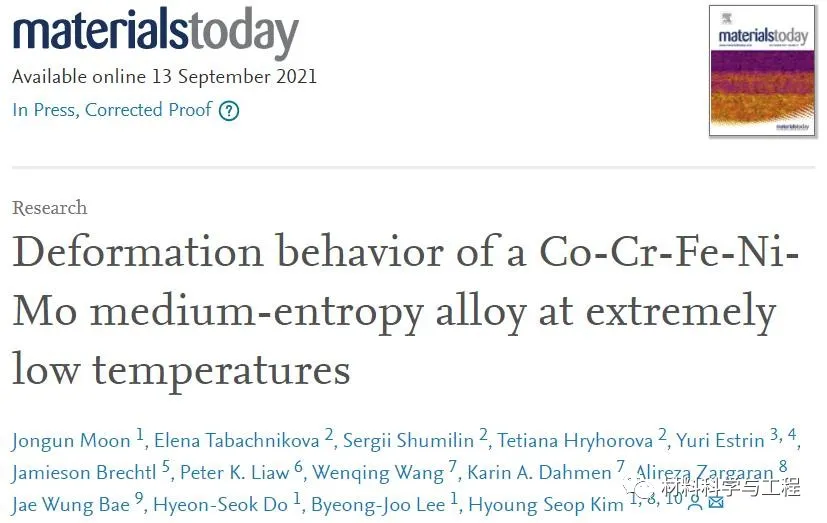 日前,来自韩国浦项理工大学的Hyoung Seop Kim等研究者,报道了一种中熵合金从室温直到0.5K低温下的力学和微观结构特征。相关论文以题为“Deformation behaviorof a Co-Cr-Fe-Ni-Mo medium-entropy alloy at extremely low temperatures”发表在Materials Today上。