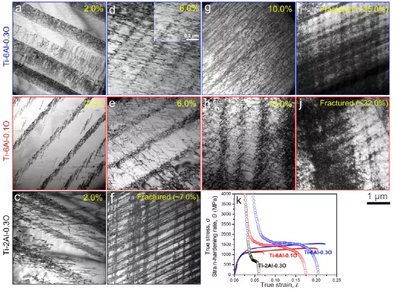图3 Ti-2Al-0.3 O、Ti-6Al-0.1 O和Ti-6Al-0.3 O合金在选定应变下低温拉伸变形后最终断裂的典型位错形貌。给出了三种合金(k)的应变硬化速率曲线,供参考。在变形初期(2.0%),三种合金均出现a-cplanar滑移带。随着变形量的进一步增加(从6%到断裂),Ti-2Al-0.3 O合金的局部变形更为严重,而Ti-6Al-0.1 O和Ti-6Al-0.3 O合金的局部变形更为严重。在平面滑移带h,j,g,i之间,由于位错纠缠和可能的交叉滑移,形变发生了明显的离域化。在Ti-6Al0.3 O合金中,离域发生比Ti-6Al-0.1 O合金更早。比例尺适用于图中的所有面板。