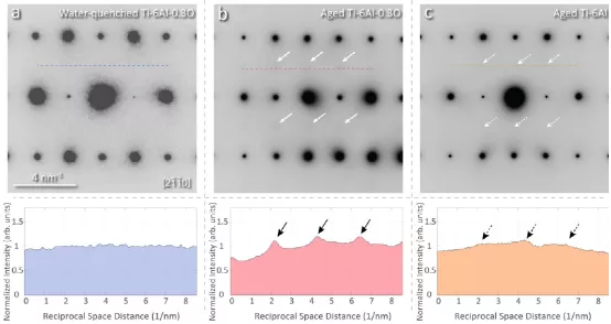 图5选择合金和工艺条件下的[2 -1 -1 0] 衍射图对比。(a)[2 -1 -1 0]水淬Ti-6Al0.3O合金的衍射谱。(b)时效Ti-6Al-0.3 O合金的[2 -1 -1 0]衍射图谱。白色箭头表示Ti3Al超晶格的扩散散射。(c)时效Ti-6Al合金的[2 -1 -1 0]衍射图谱。白色虚线箭头表示Ti3Al超晶格非常微弱的漫射散射。对应的归一化强度分布图沿虚线如下所示。