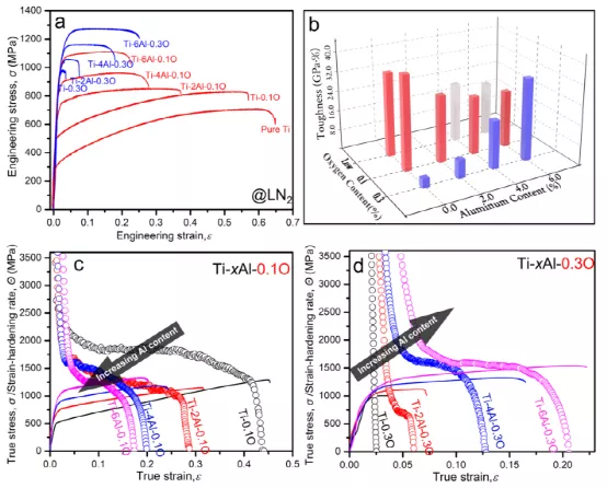 图1 液氮温度下Ti-Al-O三元合金的力学性能。a Ti-O和Ti-Al-O合金在应变速率为10?3s?1(所有成分为wt.%)的液氮中测试的工程应力-应变曲线。b3d图显示了铝和氧含量对Ti-O和Ti-Al-O合金在液氮中的拉伸韧性(工程应力-应变曲线下覆盖的区域)的综合影响。Ti-xAl-0.1 Ocand Ti-xAl-0.3 Odalloy体系(x= 0,2,4,6)在液氮条件下的真应力-应变曲线(实线)和应变硬化速率曲线(符号)随着铝含量的增加,两种合金体系的应变硬化速率和拉伸韧性呈相反的趋势。