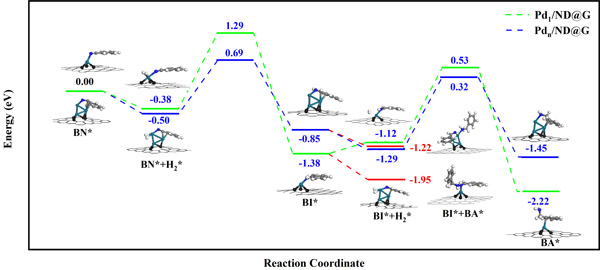 图3. Pd1-Gr和Pdn-Gr结构模型上苯甲腈加氢能量变化曲线。