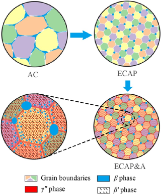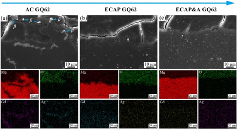 在3.5wt%NaCl溶液中研究了具有高强度-延展性协同作用的细晶粒Mg-6Gd-2Ag(wt%)合金的微观结构和腐蚀行为,并与铸态合金进行了比较。得出以下结论:(1)ECAP工艺在Mg-Gd-Ag合金中诱导出细晶结构,随后的时效带出嵌入细晶基体中的分层析出物,其由β相亚微粒、β相纳米粒子、γ”相纳米片和β’相纳米片组成。