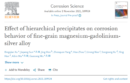 相关研究以题“Effect of hierarchical precipitates on corrosion behavior of fine-grain magnesium-gadolinium-silver alloy”发表在Corrosion Science上。