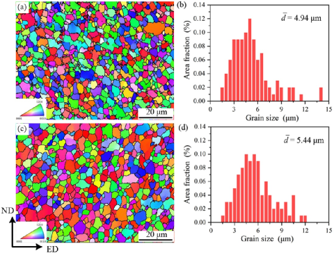图2(a,b)ECAP GQ62和(c,d)ECAP&A GQ62的EBSD结果。(a,c)反极图(IPF)和(b,d)晶粒尺寸统计。