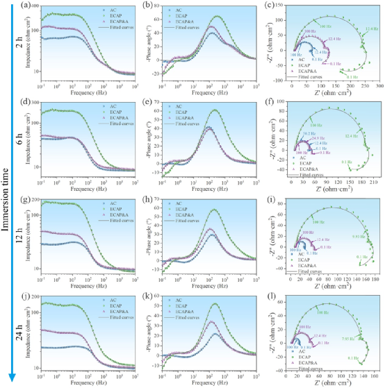 图11 (a,d,g,j)波德阻抗图,(b,e,h,k)波德相位角图,和(c,f,i,l)所有研究合金在浸入(ac)2小时、(df)6小时、(gi)12小时和(jl)24小时后的奈奎斯特图。