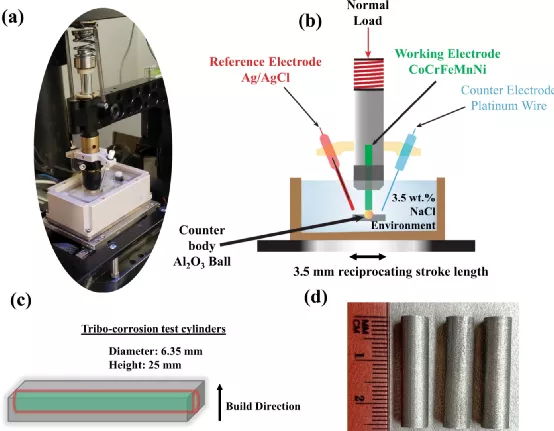 图5摩擦腐蚀装置。(a)安装在摩擦计上的摩擦腐蚀模块。(b)摩擦腐蚀试验装置的示意图,显示了三电极电池((Ag/AgCl参比电极、CoCrFeMnNi工作电极和铂丝对电极)与3.5 wt% NaCl环境下的扁球往复接触(Al2O3)的耦合。(c)打印的AM CoCrFeMnNi板示意图(构建方向由箭头指示),使用放电加工(EDM)切割出摩擦腐蚀圆柱形样品。(d)直径6.35 mm,长度25 mm的圆柱形HEA工作电极。