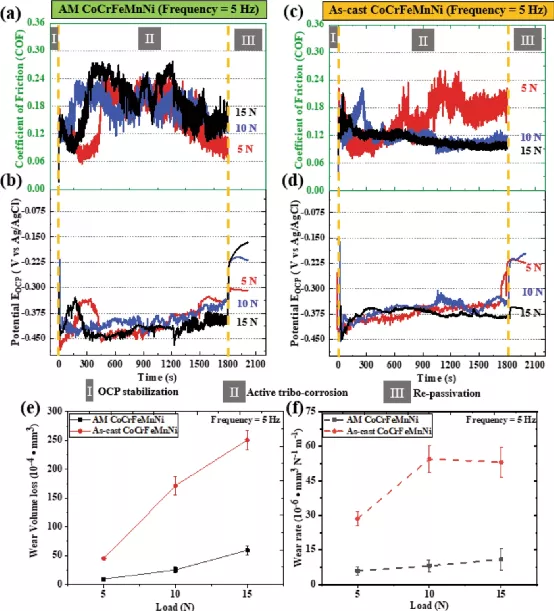 图3 5 N、10 N和15 N载荷对CoCrFeMnNi摩擦腐蚀行为的影响。(a)AM CoCrFeMnNi的摩擦系数(COF)和(b)开路电位(Eocp)在3.5 wt% NaCl,5 Hz频率下与负载的函数。铸态CoCrFeMnNi的(c)COF和(d)OCP在3.5 wt% NaCl,5 Hz频率下与负载的函数。在5 Hz频率下,的OCP随3.5 wt% NaCl载荷的变化(e)频率为5 Hz时,AM CoCrFeMnNi(实心黑线)和铸造CoCrFeMnNi(实心红线)的磨损体积损失于负载的函数。(f)频率为5 Hz时,AM CoCrFeMnNi(虚线黑色)和铸态CoCrFeMnNi(虚线红色)的磨损率与负载的函数。