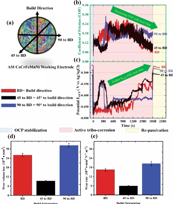 图2 构建方向对AM-ed CoCrFeMnNi摩擦腐蚀行为的影响。(a)研究的三个方向的示意图。(b)摩擦系数。(c)开路电位。(d)磨损量损失。(e)三个建造方向的磨损率。