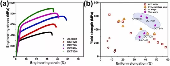 图 7.(a) 竣工和DCT处理的CoCrFeMnNi HEA样品的工程应力-应变曲线。(b) 产量强度的比较(σy)和失效伸长率(εf)在这项工作中获得的FCC HEAs通过各种制备和后处理方法制造,以及增材制造的常规合金。