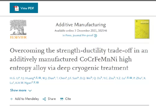 导读:通过激光熔融沉积进行增材制造是一种从粉末原料中制造复杂形状合金的强大技术。然而,此类产品通常具有较差的机械性能,无法通过冷轧或成型等传统加工手段来改善,因为这些会破坏制造的形状。本文提出深度低温处理(DCT)是提高激光熔融沉积的CoCrFeMnNi高熵合金(HEA)在室温下力学性能的一种简单有效的方法。发现DCT在增材制造的 CoCrFeMnNi HEA中引入大的压缩残余应力和晶体缺陷,包括位错、堆垛层错、纳米孪晶和纳米晶粒。纳米孪晶在强化中起关键作用,对DCT处理的CoCrFeMnNi HEA 贡献 51.0~246.8 MPa,而压缩残余应力被认为是通过抑制裂纹形成来提高延展性的原因。在低温均热过程中明显产生了结晶缺陷,这也导致了DCT结束时再加热时的残余压应力。目前的工作将深度低温处理 DCT 确立为同时提高增材制造合金强度和塑性的有效方法。