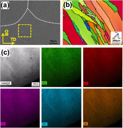 图 3.(a) 显示BD×TD平面上的柱状晶粒的扫描电镜图像,(b)显示晶粒尺寸分布的IPF图,以及(c)竣工CoCrFeMnNi HEA样品的元素分布图。