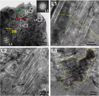图 6.DCT120h样品的TEM分析显示了代表性的微观结构,如位错,纳米孪生,堆叠故障和纳米颗粒,分别标记为DS,NT,SF和NG。插图显示了L1和L3区域的相应SAED模式,HR-TEM图像分别显示了L1,L2和L3区域的相应微观结构。