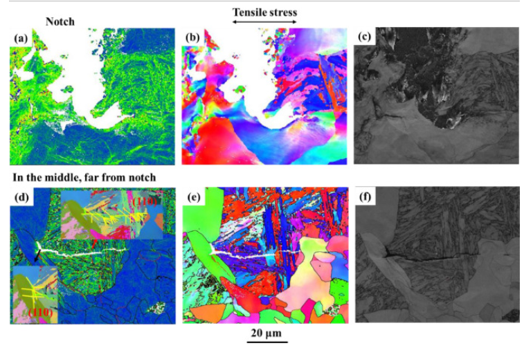 图20 带电钒钼钢的EBSD图,显示沿铁素体/马氏体边界的裂纹扩展:(a-c)取自缺口区域,(a) KAM图,显示缺口根部,主裂纹平行于拉伸轴扩展成马氏体岛;IPF地图;公元前地图;(d-f)显示了远离垂直于拉伸轴传播的缺口的二次开裂,并在(d) KAM地图、(e) IPF地图、(f) BC地图上标记了(110)痕迹