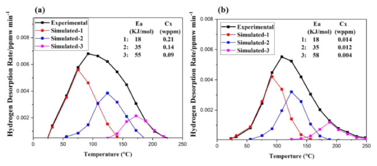 热解吸光谱显示两种钢有两个明显的峰,低温峰与晶界、相界、位错和共格沉淀处的俘获有关,高温峰与半共格沉淀处的俘获有关。 充氢导致钛钼钢严重脆化,在拉伸试验中出现屈服失效。带电拉伸样品中的裂纹起始似乎是由与应变分配相关的位错胞边界处的空洞引起的,符合HELP型机制。