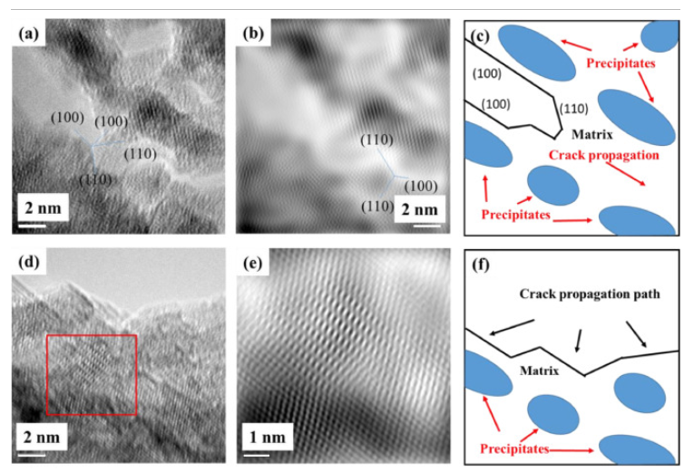 图16 钛钼钢带电拉伸断裂中的二次裂纹扩展:(a)取自二次裂纹的HRTEM图像和(b)来自(a)的快速傅立叶变换滤波图像,显示裂纹沿(100)和(110)扩展;(c)来自(a)的示意图;(d)显示裂纹尾流的HRTEM图像,显示裂纹的原子级扩展。沉淀物标记在表面以下。生长的裂纹避免了沉淀;(e)来自(d)中标记的区域的FFT滤波图像,显示裂纹局部的沉淀物;(f)来自(d)的示意图